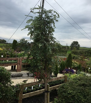 More slender version of common mountain ash. Bears a bigger berry and it has fantasic autumn colour. Extermelly easy to grow and very hardy Looks great when planted in clusters or on its own. At maturity this tree will have stored 530kg of Carbon.
